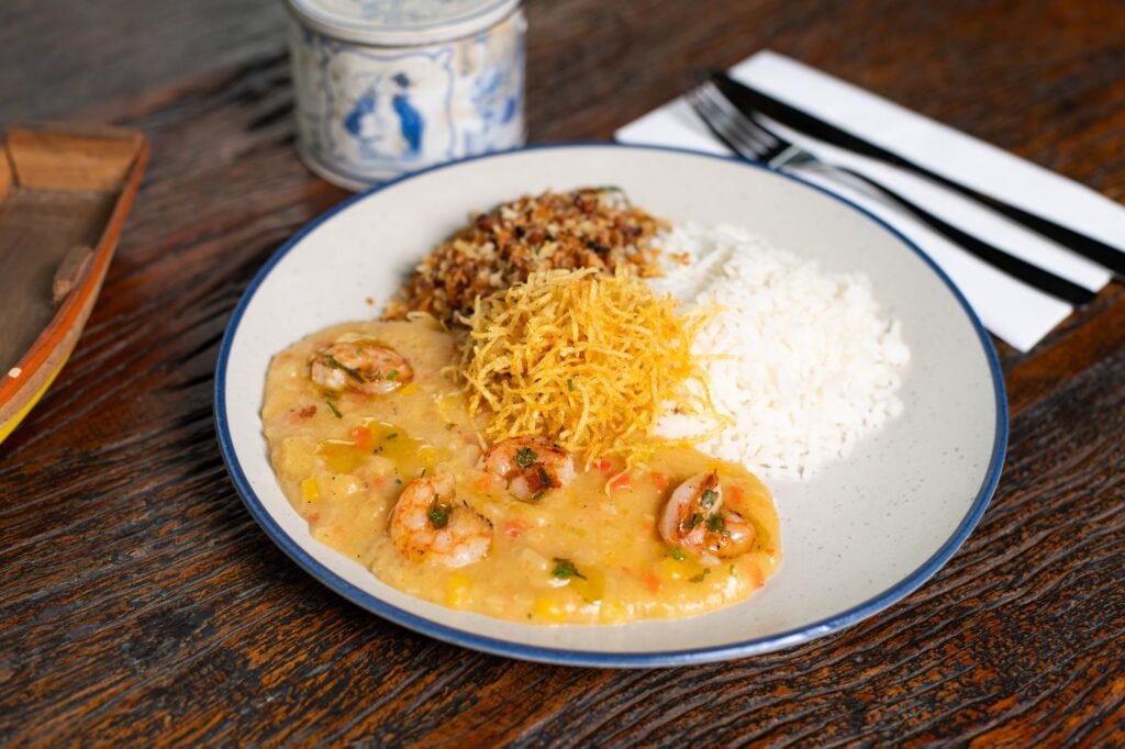 Clássico bobó de camarão servido com arroz branco, farofa agridoce de abacaxi e crispy de batata.