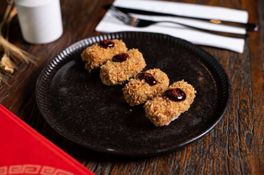 Mini croquete de costelinha suína desfiada com molho barbecue.