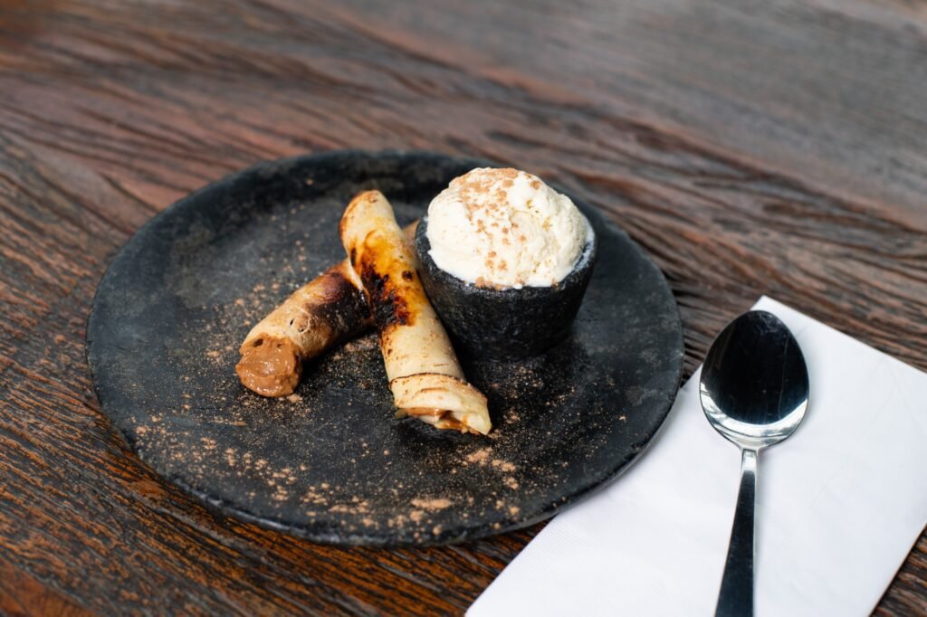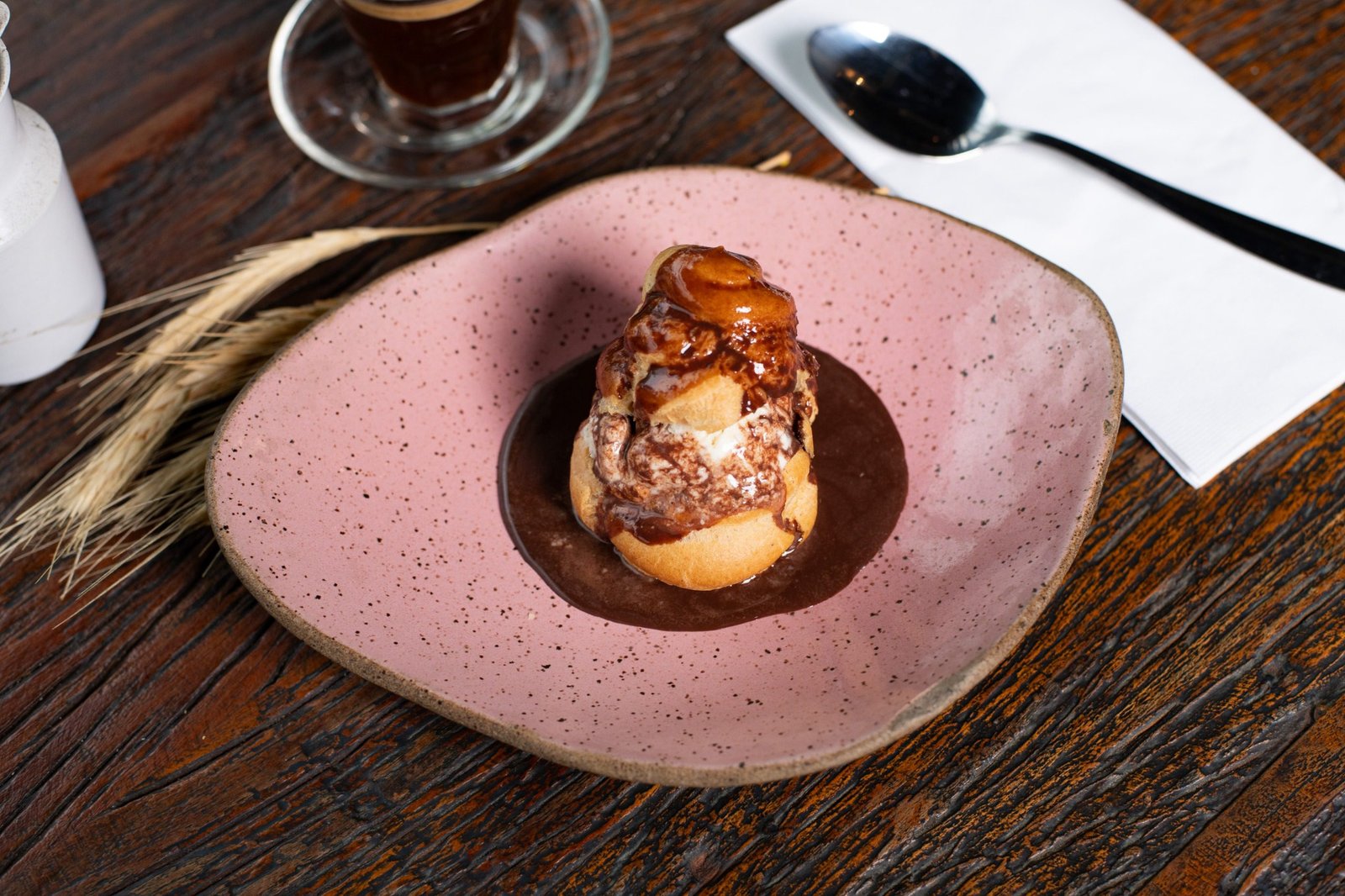 Profiteroles recheada com sorvete de baunilha, finalizada com calda de chocolate quente.