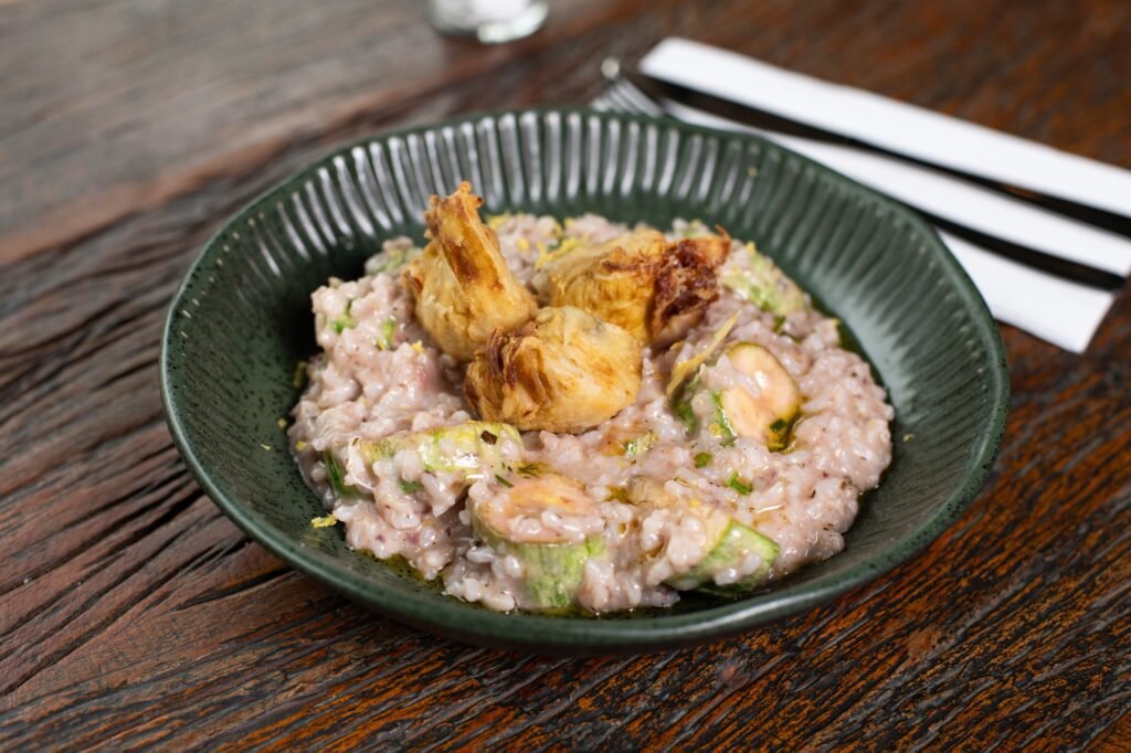 Risoto de abobrinha grelhada e salteada, com tapenade de azeitonas pretas, manjericão e limão siciliano, finalizado com coração de alcachofra crocante.