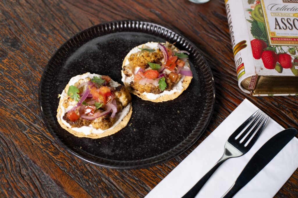 Taco de milho com couve-flor grelhada, sour cream e vinagrete fresco.