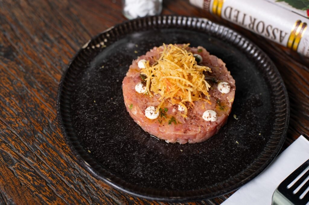 Atum picado na ponta da faca, levemente temperado com maionese spicy, finalizado com crispy de batata.